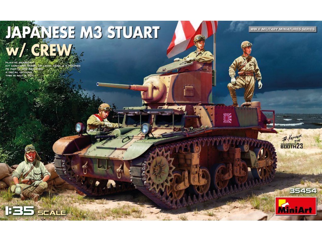 MiniArt's 1/35th scale model of the Japanese M3 Stuart w/ Crew represents the American M3 Stuart light tank captured and deployed by the Japanese Army during World War II. The kit includes a detailed model of the tank and crew figures. The package does not include paint or glue needed for assembly.