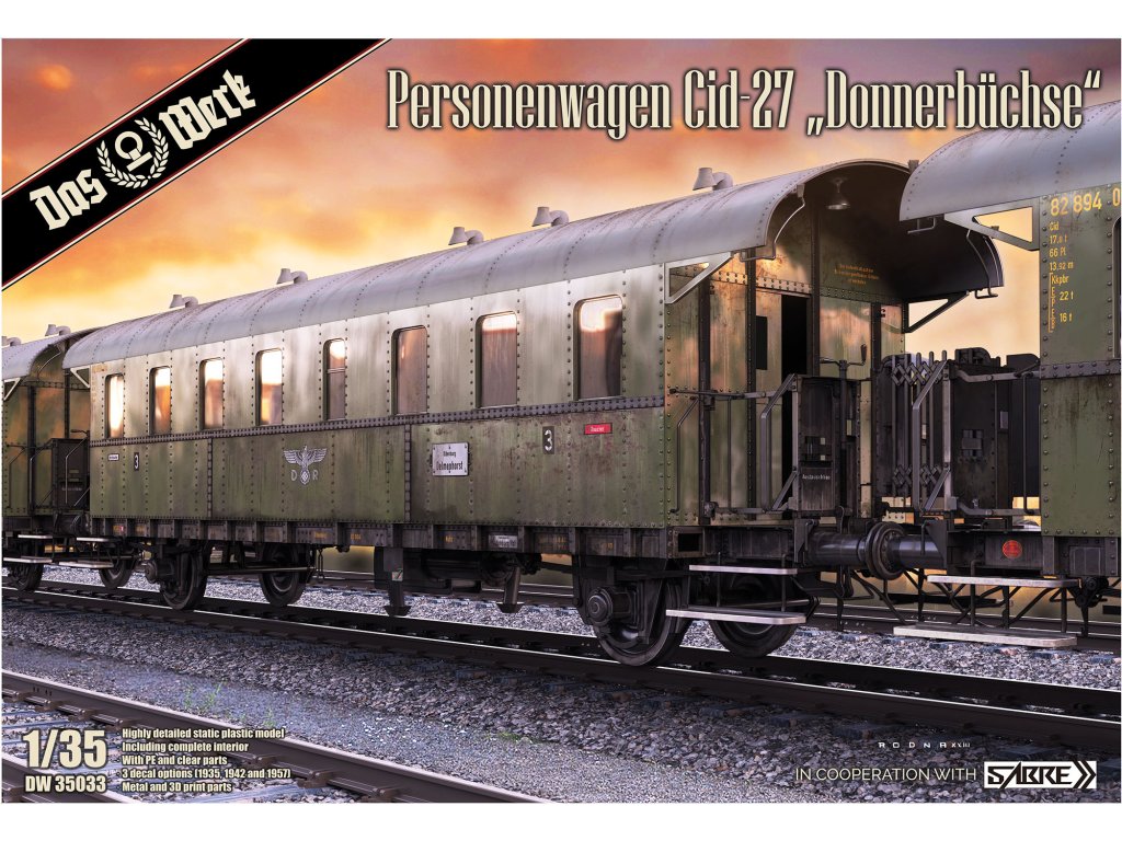 1:35 scale model of the Cid-27 “Donnerbüchse” railway wagon with a full interior, metal, and 3D-printed parts. Includes three decal options and railway track