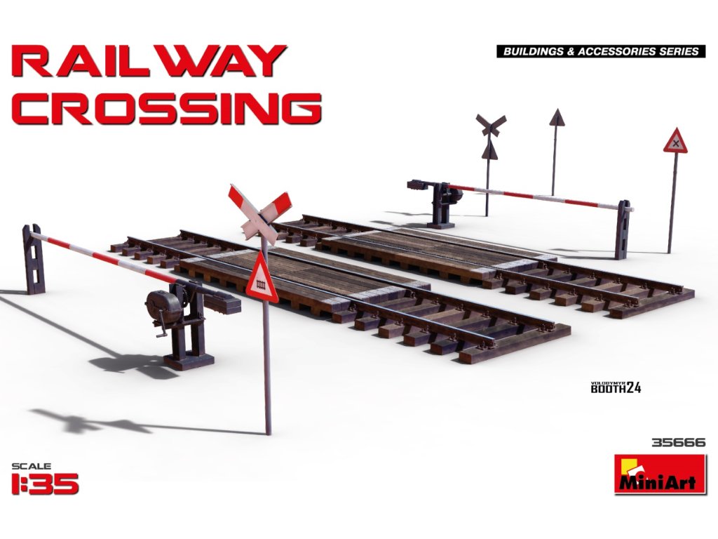MiniArt's 1/35th scale Railway Crossing is a detailed model suitable for military and civilian dioramas. It includes realistically made tracks, crossing area and other details. The package does not include paint or glue needed for assembly.