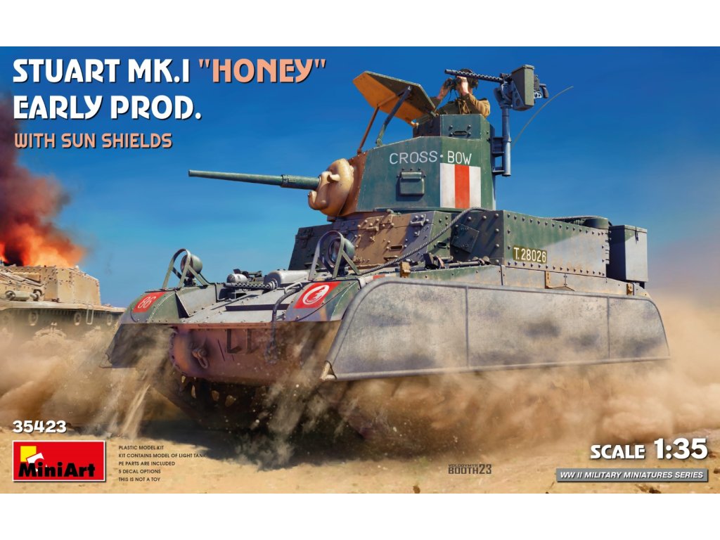 Model Stuart Mk.I "Honey" Early Prod. w/Sun Shields in 1/35th scale by MiniArt is a British version of the American M3 Stuart light tank, which was used mainly in the North African campaigns during WWII. The kit includes detailed plastic parts, realistic interior, photo-etched parts and leakedcamouflage sun visors used by British troops to replicate trucks. The package does not include the paint or adhesives needed for assembly.