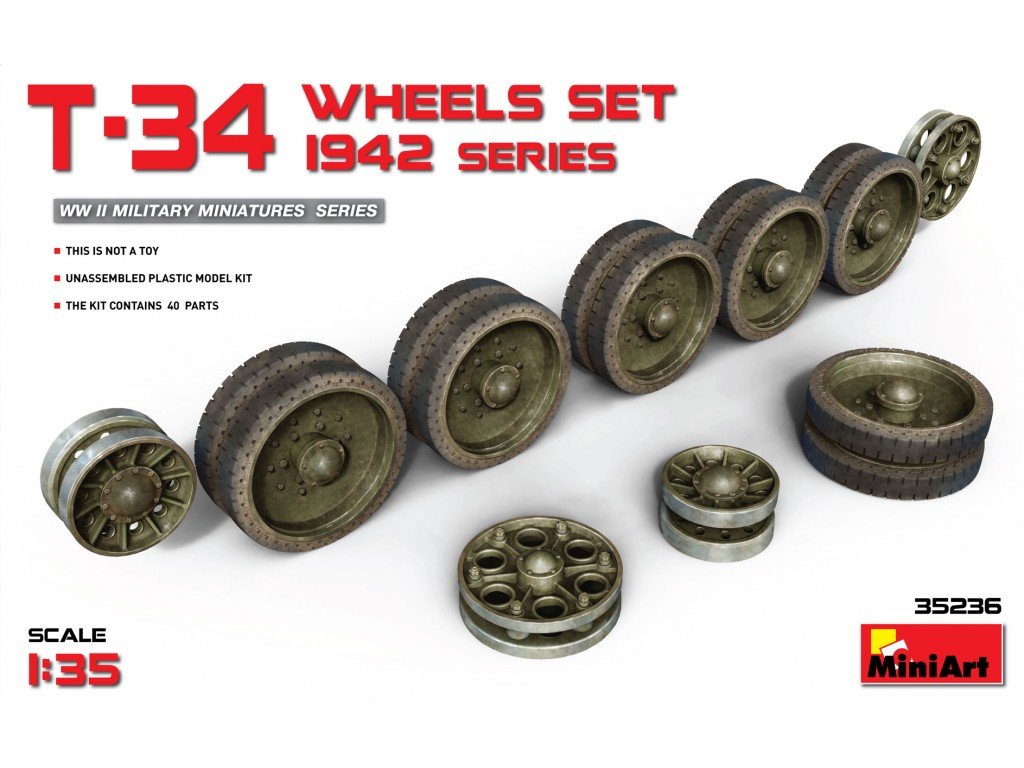 MiniArt's T-34 Wheels Set. 1942 Series in 1/35th scale offers authentic designs of the disc and cast wheels used on T-34 tanks in 1942. Designed to complement or replace kits with vehicles from this period. Package does not include paint or glue needed for assembly.