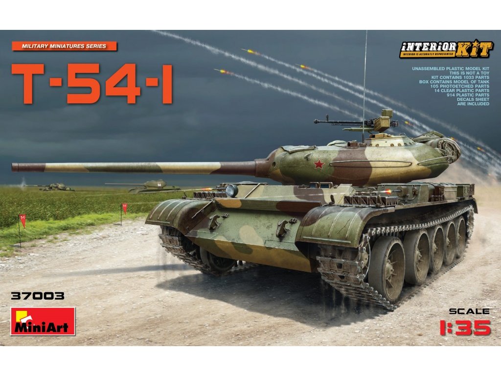 The 1/35th scale model of the T-54-1 depicts the first production version of the Soviet medium tank produced since 1947. The kit offers a complete interior including engine, transmission, fighting compartment and turret, complete with realistic details and armament. The package does not include paint or glue needed for assembly.