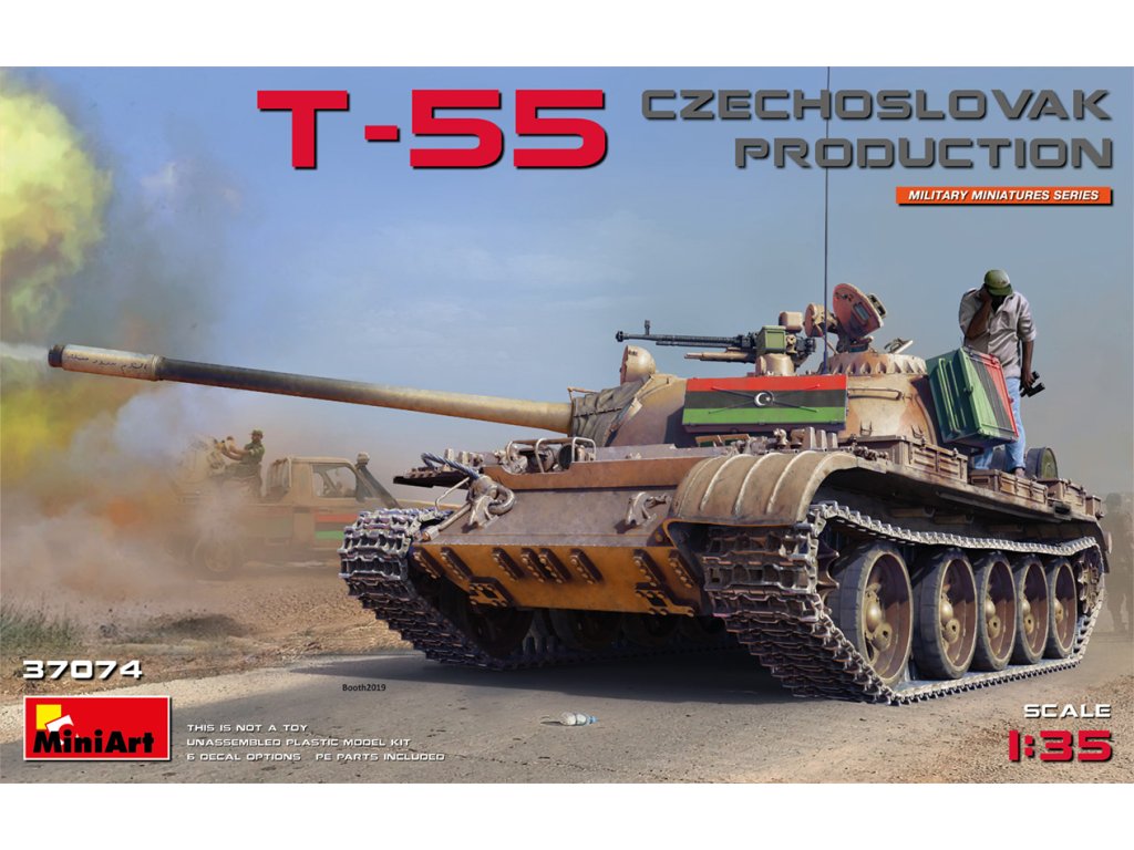 MiniArt 1/35 T-55 Czechoslovak Production offers a kit with fully rendered interior, including driver's station, fighting compartment, turret and engine compartment. The model closely matches the Czechoslovak design with typical production features such as welds, turret details and equipment.