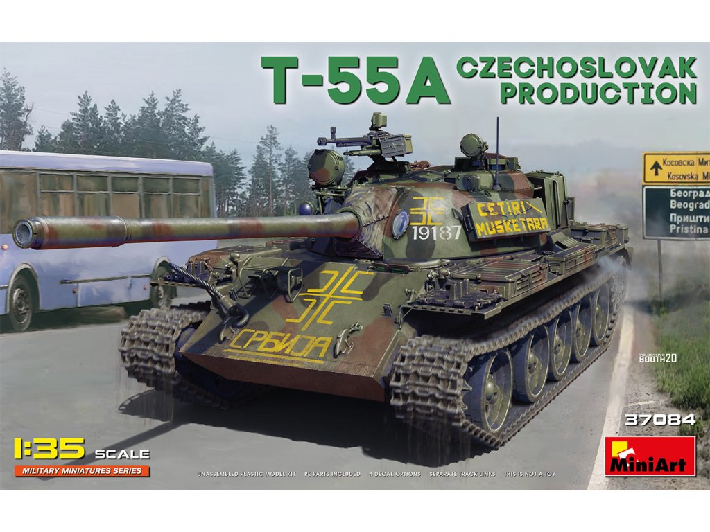 MiniArt's T-55A Czechoslovak Production 1/35th scale model represents the Czechoslovak version of the Soviet T-55A medium tank. The kit contains detailed plastic parts including complete interior, engine and faithfully processed production differences. The package does not include paint or glue needed for assembly.