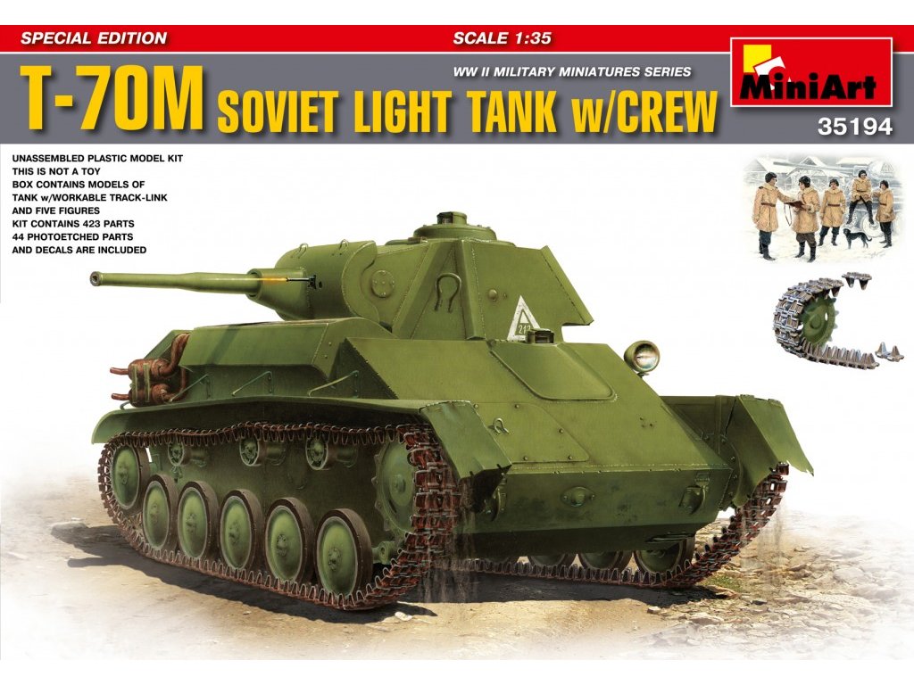 The T-70M Special Edition 1/35th scale model by MiniArt is a Soviet light tank from the second half of World War II, produced since 1943 as an improved version of the T-70 type. The kit includes plastic parts, detailed interior and accessories specific to the Special Edition. The package does not include the paint or glue needed for assembly.