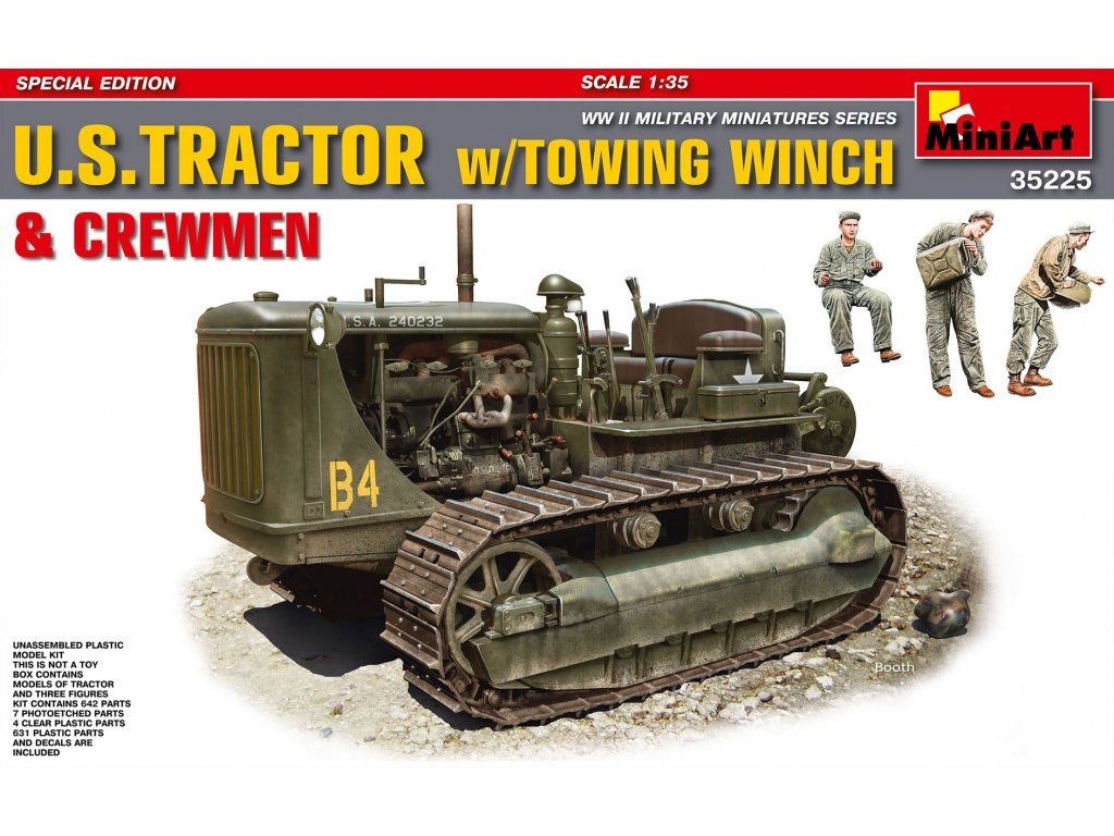 The U.S. Tractor w/Towing Winch & Crewmen Special Edition 1/35th scale model by MiniArt is a detailed model of a WWII era American tracked tractor with winch and crew figures. Package does not include paint or glue needed for assembly.
