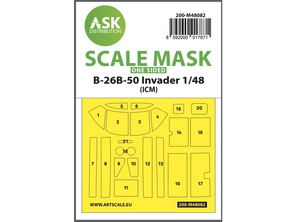 1/48 B-26B-50 Invader single-sided self-adhesive clear parts mask and wheel masks for ICM kit, catalog number 200-M48082. Pre-cut Kabuki masking film of the highest quality, the best technological production of the film cross-section. All mask parts printed with numbers, which together with the instructions define the exact position, canand application on the masked model - a great facilitation of work leading to a perfect model.