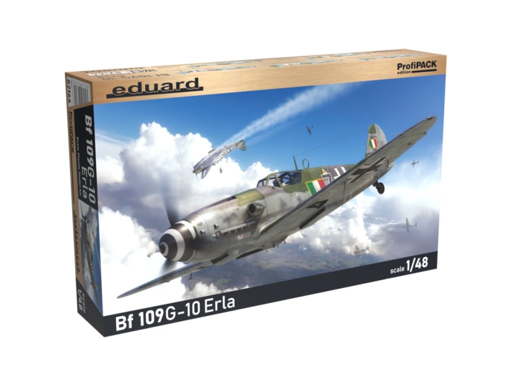 Eduard Bf 109G-10 Erla 1/48 scale kit from the ProfiPACK edition (cat. 82164) features detailed plastic parts with fine engraving, colorful etched accessories for the interior, pre-cut masks for the cockpit and wheels, and decals for five authentic camouflage schemes: