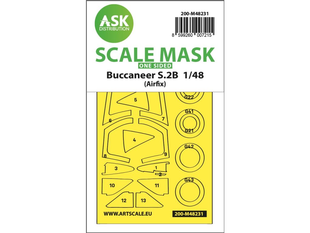 1/48 Buccaneer S.2B one-sided self-adhesive fit mask of clear parts and landing gear wheels for Airfix kit. ASK Distribution catalog number: 200-M48231