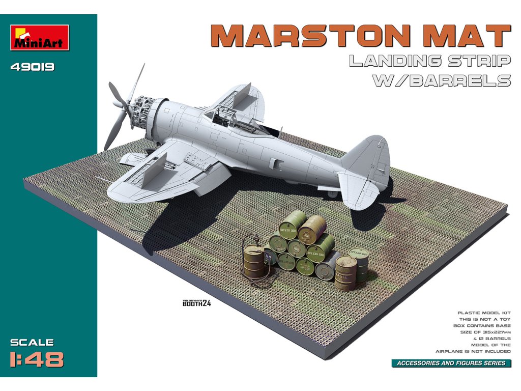 MiniArt's 1/48th scale Marston Mat Landing Strip w/Barrels is a realistic rendering of a makeshift landing strip used by Allied forces during WWII, complete with barrels as accessories. The package does not include the paint or glue needed for assembly.