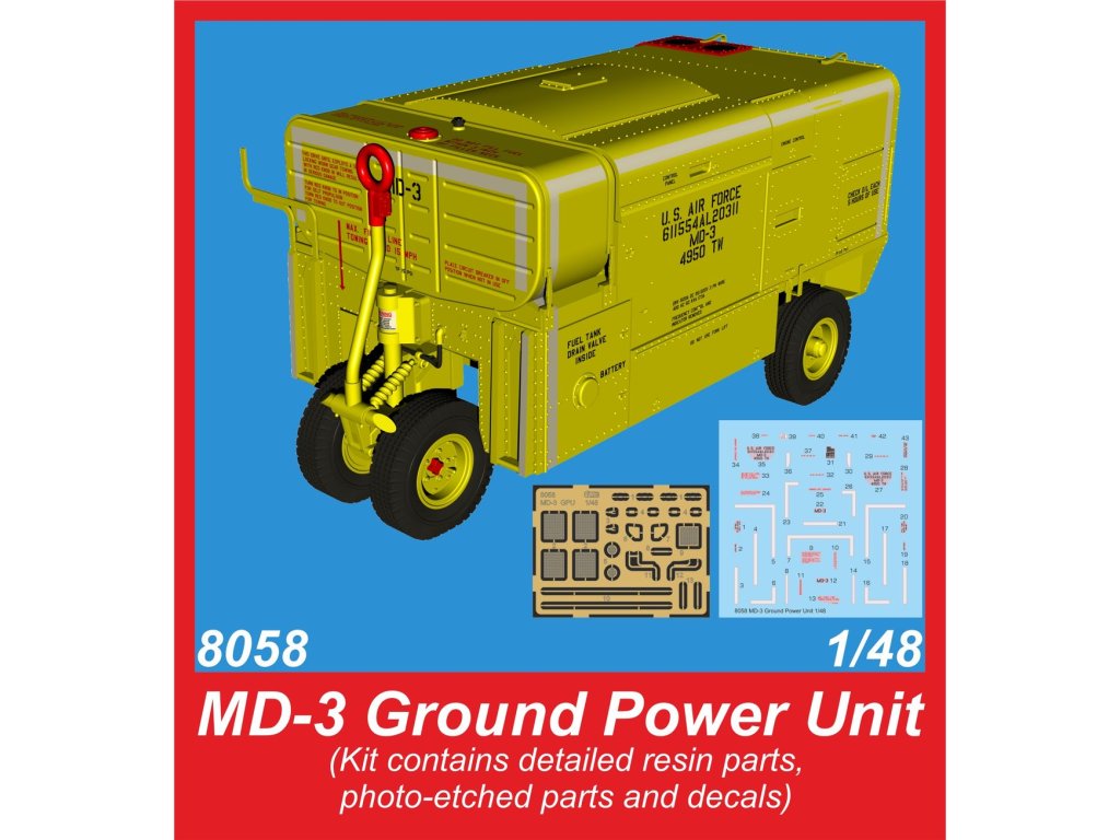 The MD-3 ground power unit was used throughout the 50s and 60s to generate electric power for starting up engines of such USAF aircraft as were the B-47, T-33 and many other with the same power requirements. The master parts of our kit have been 3D designed and produced on a 3D printer. The set also contains a PE fret and a sheet of decals.