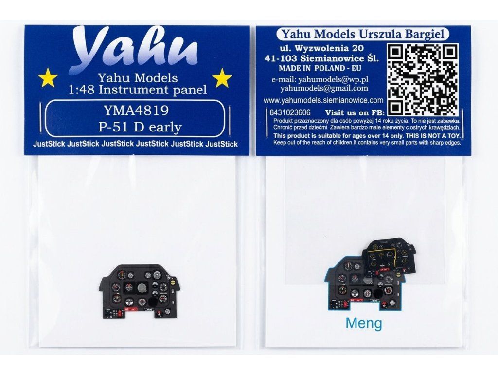The Yahu Model YMA4819 is a 1:48 scale photoetch dashboard designed for the early version of the P-51D Mustang. The kit is made of thin brass foil (photo-etched) and features accurate color printing of instruments, dials, switches and labels directly on the surface of the part - so there is no need to repaint or use decals. JustStick technology allows the part to be simply attached and snapped into place without complicated bending or shaping, making assembly much easier even for less experienced builders. The kit is primarily designed for Hasegawa's 1:48 scale kits and will likely be compatible with newer Airfix kits as well.