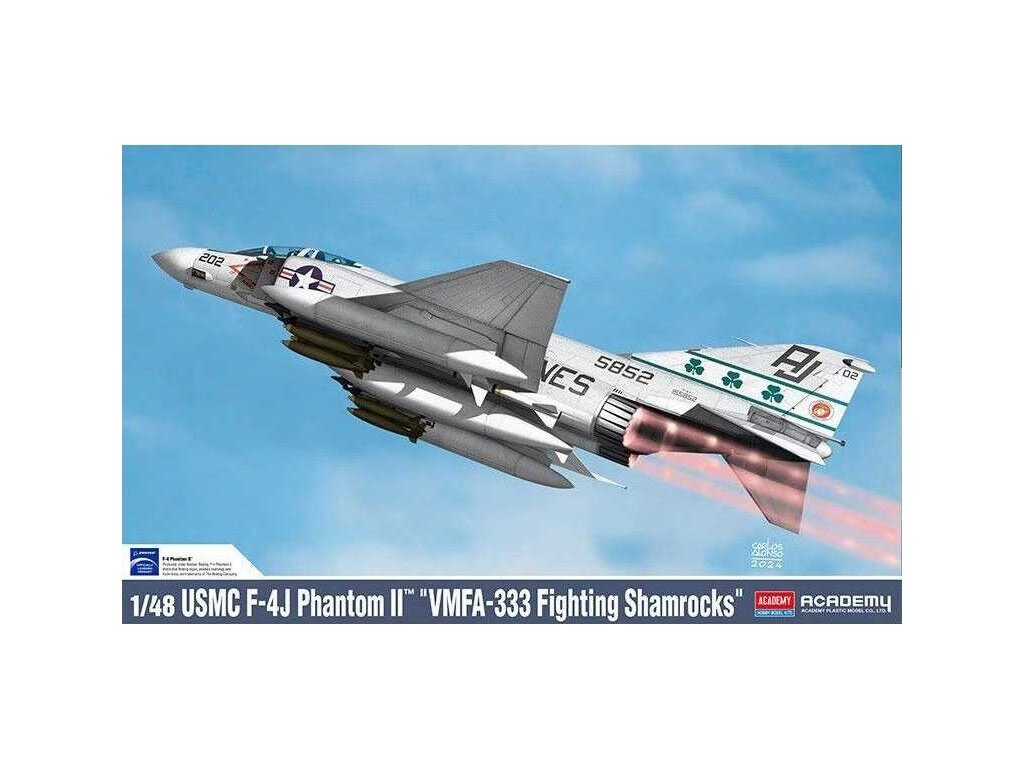 The Academy 1/72 USMC F-4J Phantom II "VMFA-333 Fighting Shamrocks" kit features precision-machined plastic parts, a realistic cockpit with detailedand a wide range of suspended armament, including AIM-7 Sparrow, AIM-9 Sidewinder and bomb slingers. The model includes authentic decals for VMFA-333 machines from the period of their deployment.