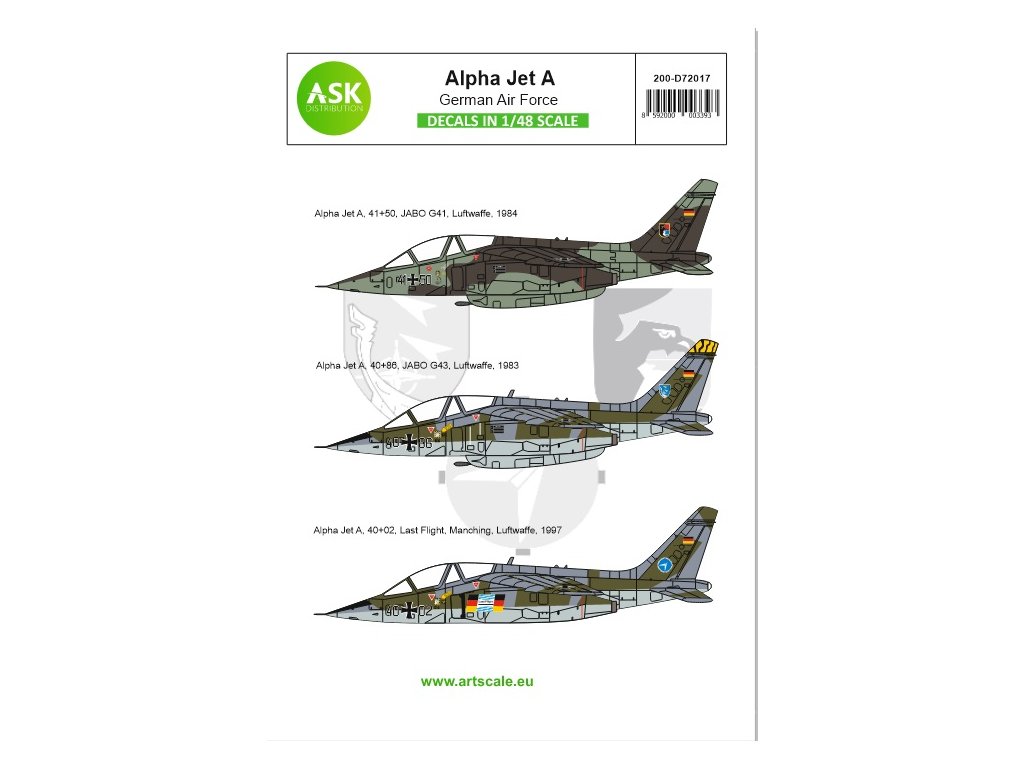 200-D72017 Alpha Jet A German Air Force - Bundeswehr 1/72 scale. Contain 3 markings.