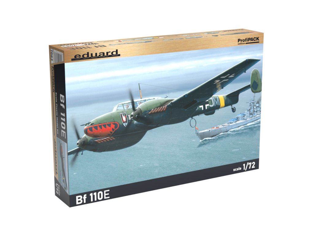 Eduard Bf 110E kit in 1/72 scale from ProfiPACK edition (cat. 7083) offers detailed plastic parts with fine engraving, color etched accessories for interiorr, pre-cut masks for the cockpit and wheels, and decals for five authentic camouflage schemes, including the machines of pilots such as Lt. Herbert Kutscha (5th /ZG 1, Soviet Union, 1942), Sonderkommando Junck (Mosul, Iraq, May 1941) and others. The model is designed for modelers interested in WWII aviation and offers a high level of detail and historical accuracy.Eduard