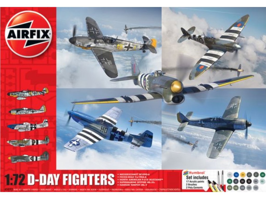 Airfix 1/72 D-Day Fighters Gift Set is a gift set containing models of iconic Allied and German fighter aircraft from the Normandy landings in June 1944. The set contains five models with varying numbers of parts and is ideal for WWII aviation history buffs. The package does not include the paint or glue needed for assembly.