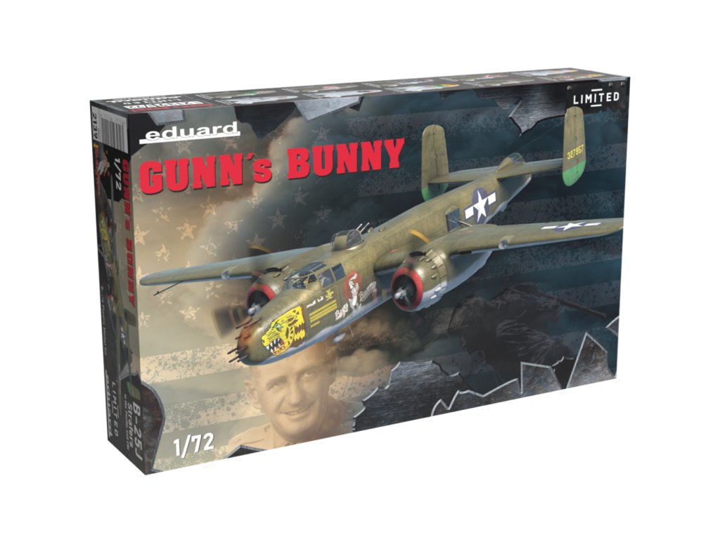 Eduard Gunn's Bunny in 1/72 scale is a limited edition kit of the American B-25J Mitchell medium bomber with glass nose from the end of WWII. War, featuring Hasegawa plastic parts, colour etched accessories, masks, resin wheels and ten camouflage schemes. The package does not include the paint or adhesives needed for assembly.