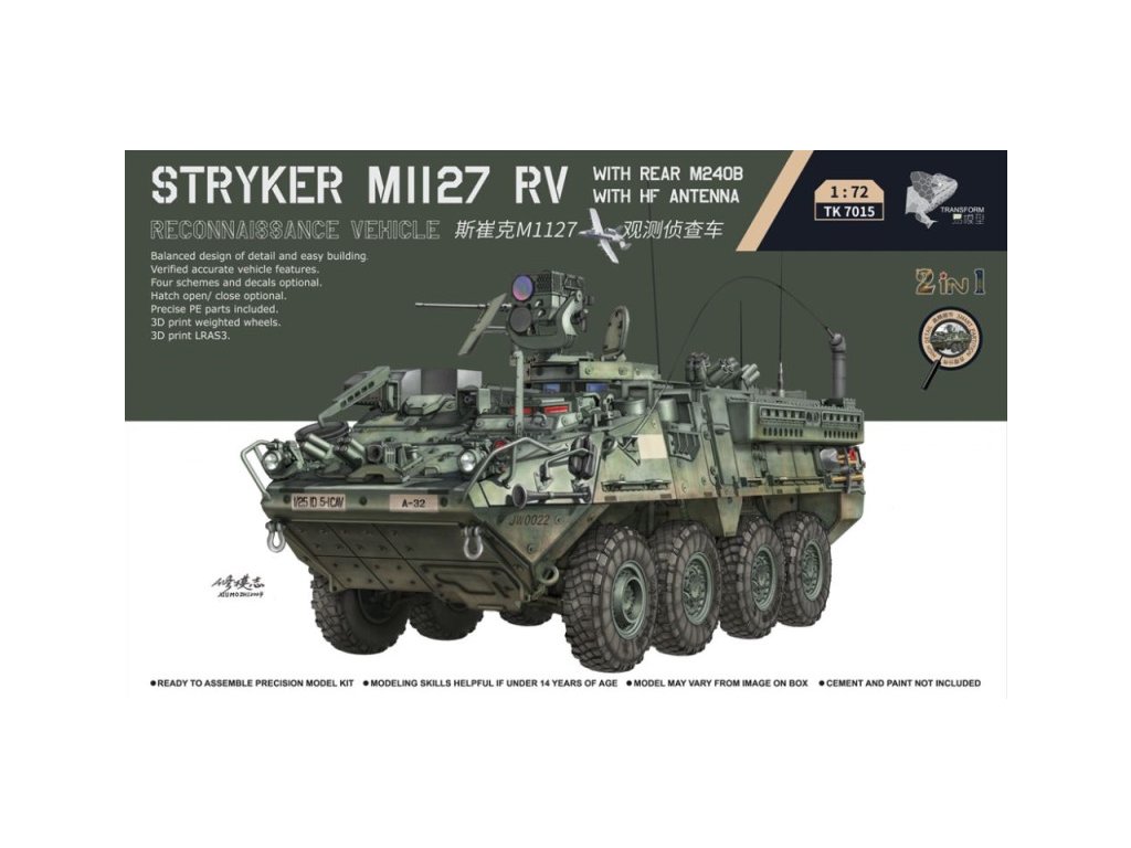 Border Model 1/72 Stryker M1127 RV (2in1) is a 1/72 scale model of the Stryker M1127 US armored reconnaissance vehicle. The RV (Reconnaissance Vehicle) variant has been developed for reconnaissance and surveillance tasks and is equipped with advanced sensors and means of communication. The kit offers the possibility to build two different versions of the vehicle and is ideal for anyone interested in modern American armoured vehicles.