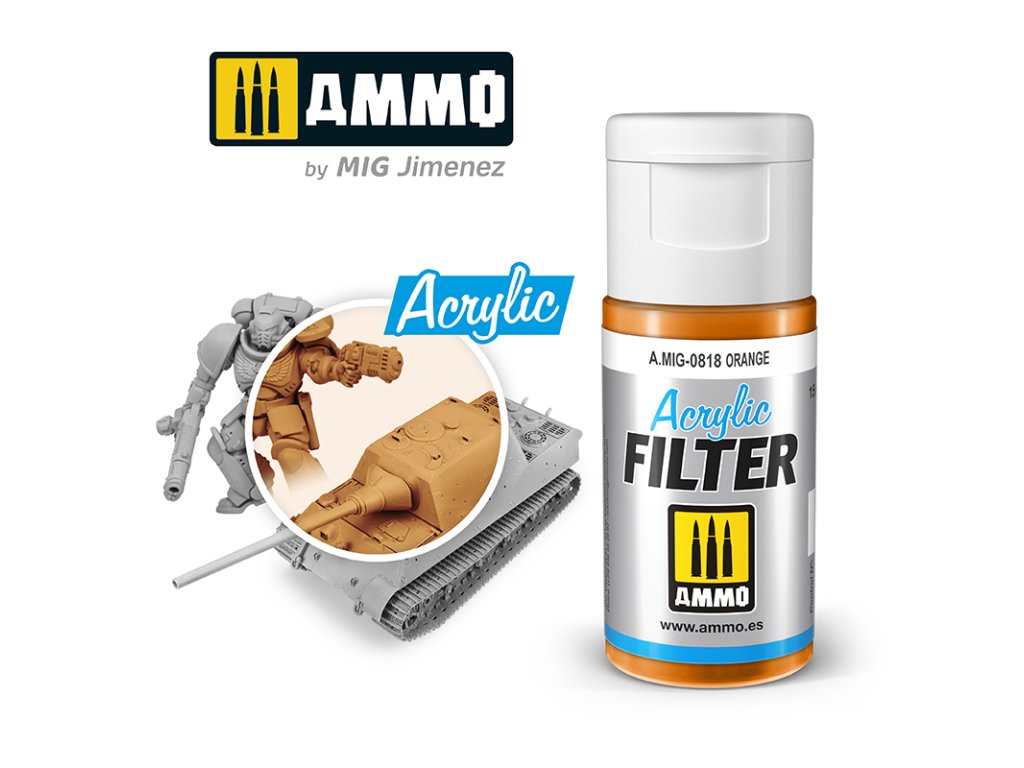 AMMO's new acrylic filters are designed to be applied directly to the model. This new range allows you to add colour variation to your miniatures, harmonize various camouflage colours, or distinguish areas with a different tone. The acrylic filter can be easily applied with a brush, which avoids the need for complicated masking. Moisten the brush with the product and apply it without flooding the surface. Thanks to the innovative formulation, the Acrylic Filters can be retouched or eliminated simply and easily with water during the extended dry time, each filter will dry completely in 24 hours. These versatile filters can also be applied by airbrush for an endless number of effects. Thanks to the wide range of 30 colours available, you won´t need to make complex mixtures, adjust for the proper thinning ratio, or adjust the tone to the intended shade. Each colour can be mixed with one another, or tinted with other AMMO acrylics. The acrylic filters can be diluted and cleaned with water, Acrylic Thinner A.MIG-2000 or Cleaner A.MIG-2001.