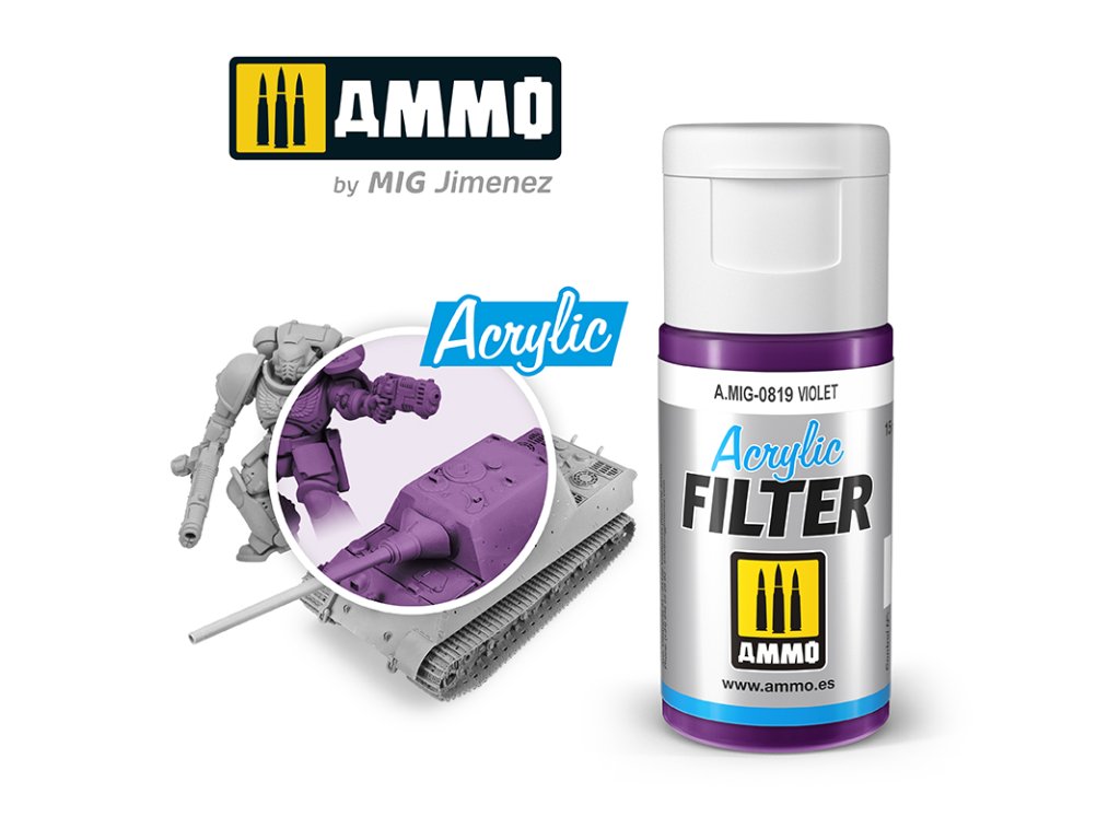 AMMO's new acrylic filters are designed to be applied directly to the model. This new range allows you to add colour variation to your miniatures, harmonize various camouflage colours, or distinguish areas with a different tone. The acrylic filter can be easily applied with a brush, which avoids the need for complicated masking. Moisten the brush with the product and apply it without flooding the surface. Thanks to the innovative formulation, the Acrylic Filters can be retouched or eliminated simply and easily with water during the extended dry time, each filter will dry completely in 24 hours. These versatile filters can also be applied by airbrush for an endless number of effects. Thanks to the wide range of 30 colours available, you won´t need to make complex mixtures, adjust for the proper thinning ratio, or adjust the tone to the intended shade. Each colour can be mixed with one another, or tinted with other AMMO acrylics. The acrylic filters can be diluted and cleaned with water, Acrylic Thinner A.MIG-2000 or Cleaner A.MIG-2001.