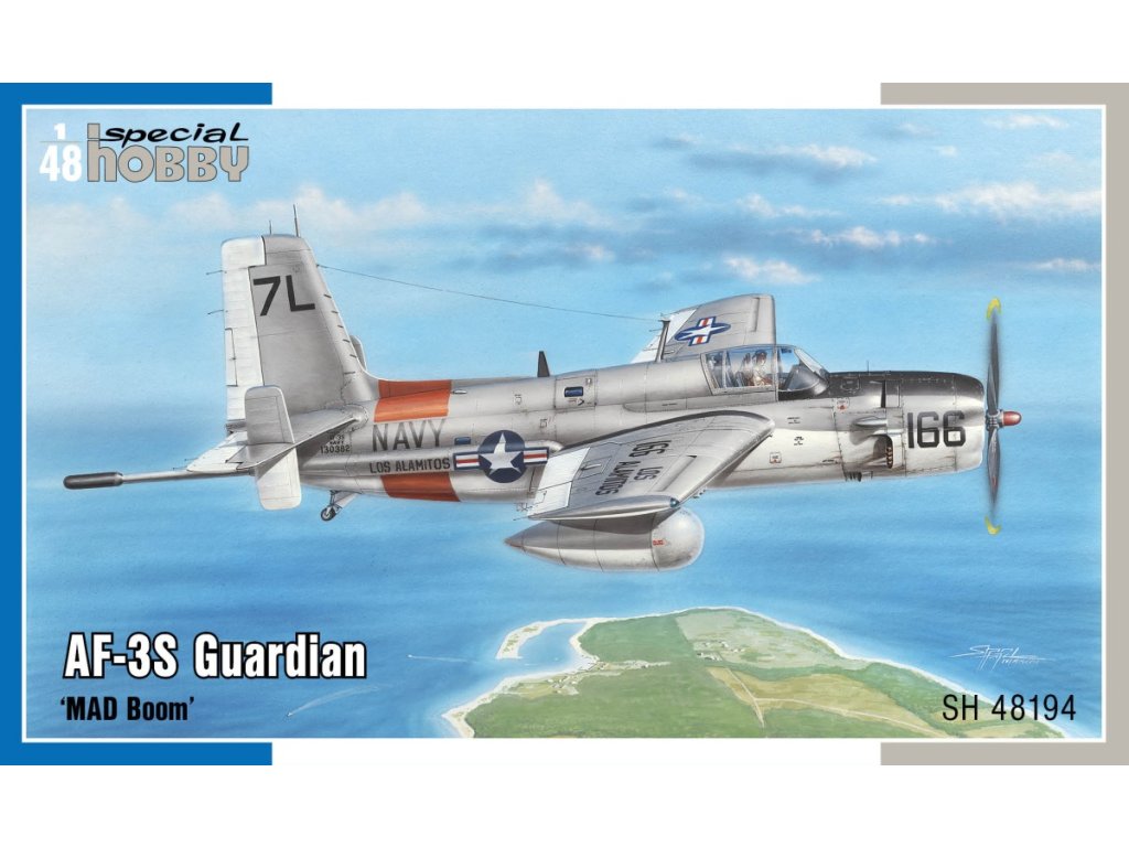 A 1/48 scale model of the AF-3S Guardian, the first anti-submarine warfare aircraft used by the US Navy starting in 1950. This version specialized in submarine detection.