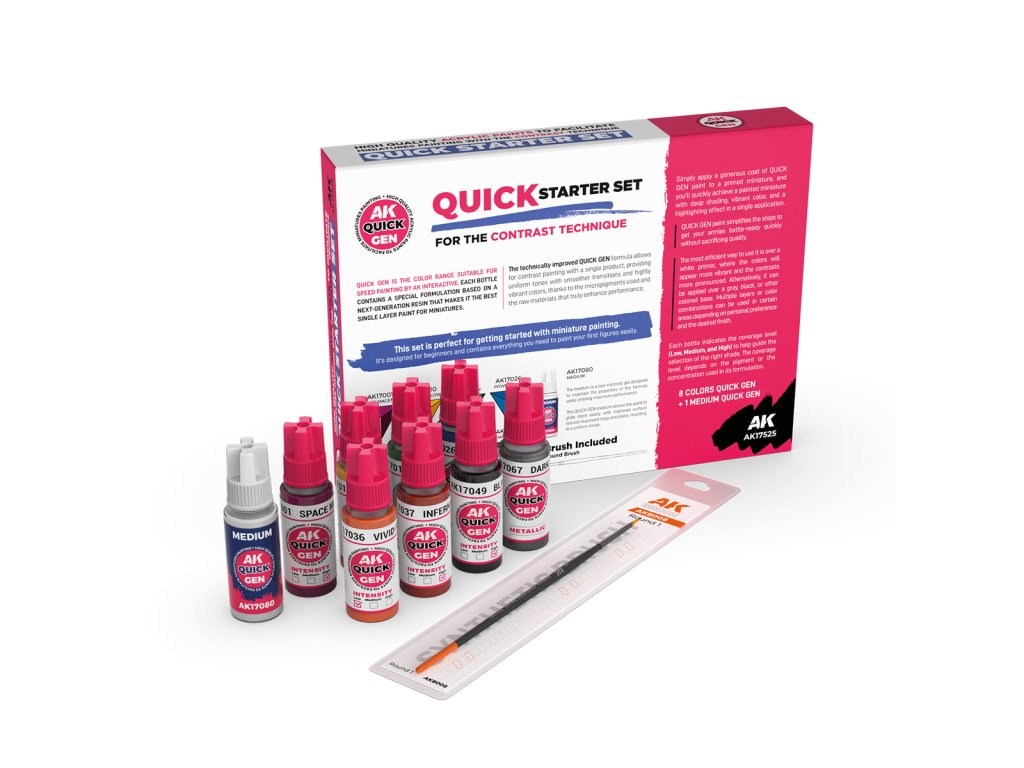 QUICK STARTER SET is the ideal choice for beginners and figure painters. It contains 8 colours from the QUICK GEN series, medium, plus a free synthetic brush, so it provides everything you need for your first contrast painting.