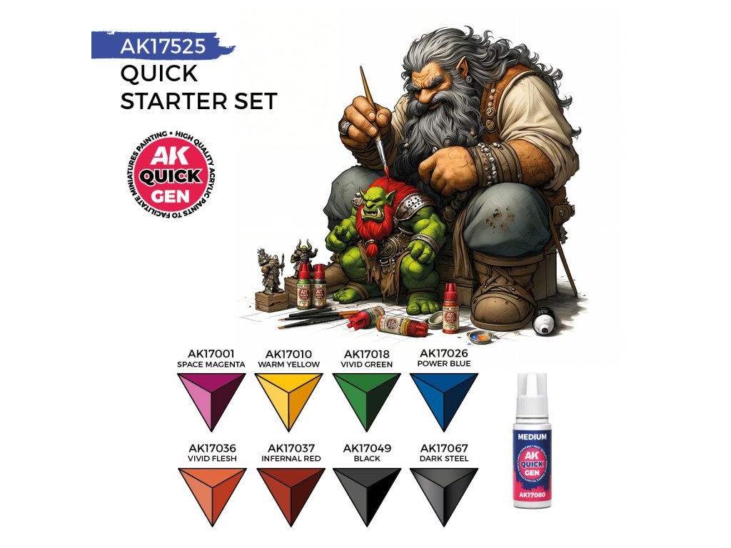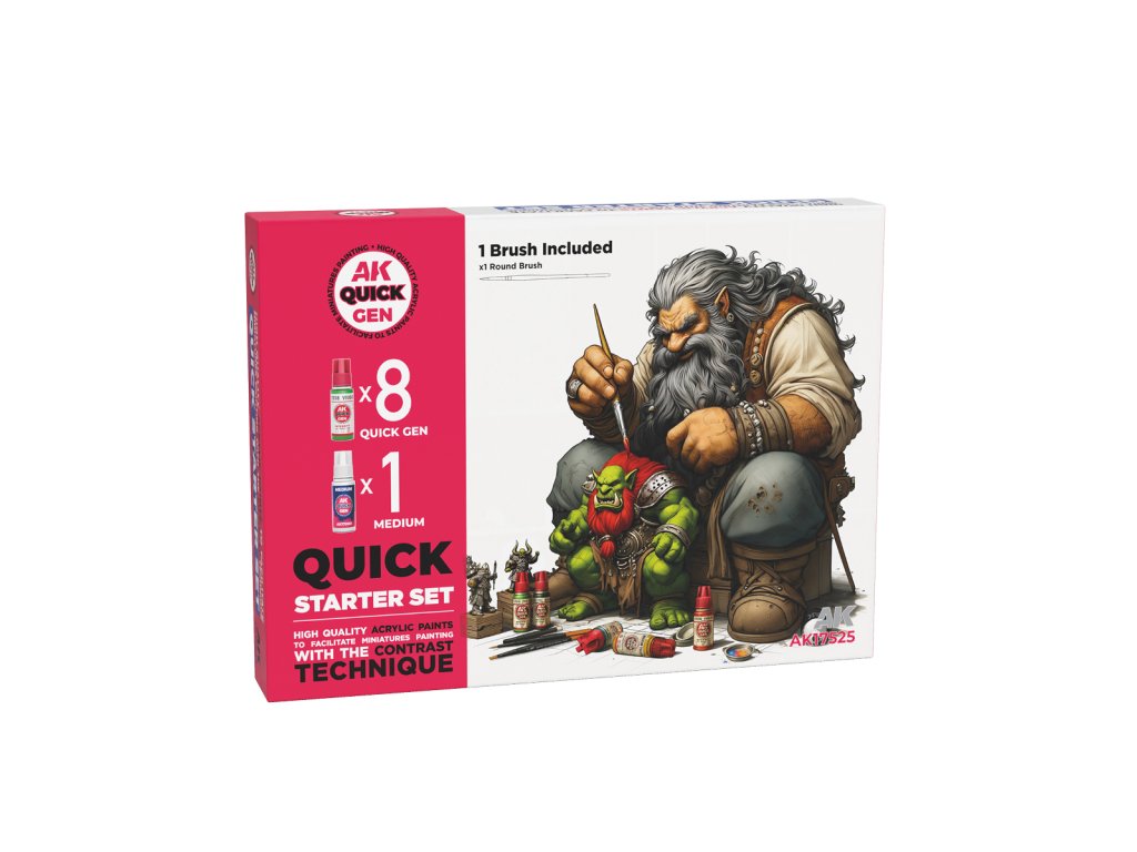 QUICK STARTER SET is designed especially for those who want to start painting miniatures quickly and easily. This set contains eight selected shades from the QUICK GEN range, which are ideal for using the contrast technique to achieve impressive results in a short space of time. Also included is a QUICK GEN Media bottle for smoother application and an even finish, and as an added bonus, a quality synthetic round brush is included free of charge.