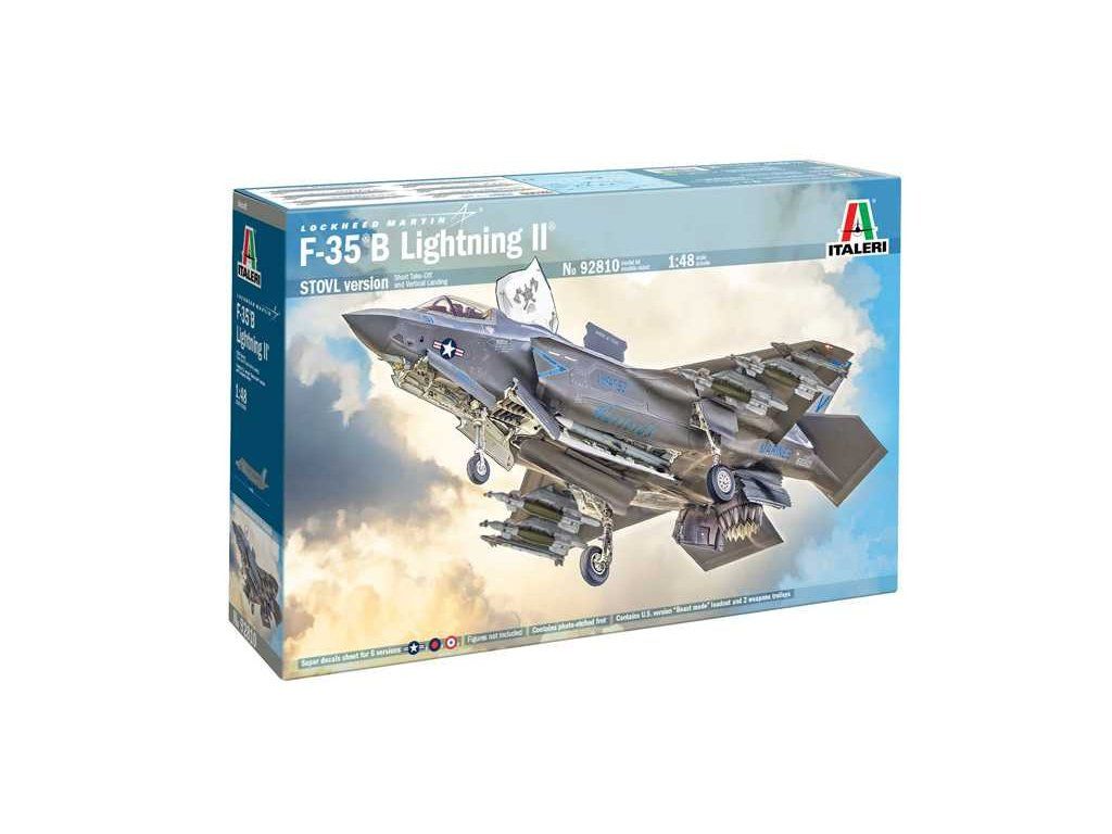 Italeri přináší v měřítku 1/48 velmi kvalitní stavebnici tohoto moderního stroje, s jemně zpracovanými detaily povrchu, výzbrojí i charakteristickými tvary F-35. Stavebnice nabízí různé možnosti konfigurace (otevřená/uzavřená schránka pro přistávací větrák, variabilní pozice kormidel a výzbroje), obtisky pro různé uživatele a přehledný návod k sestavení.