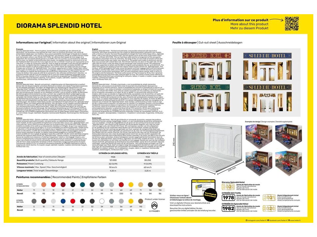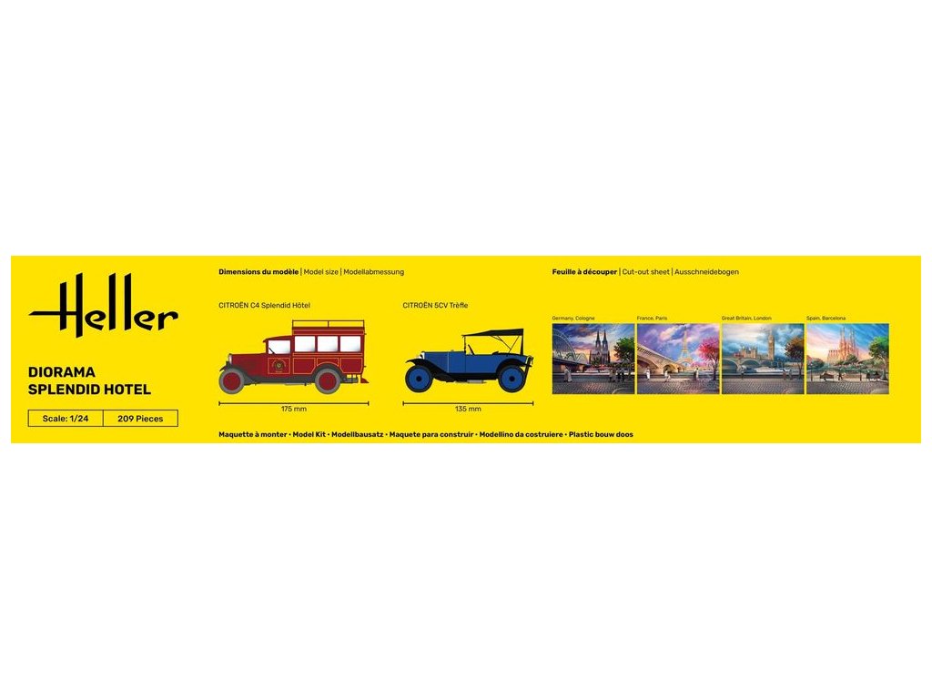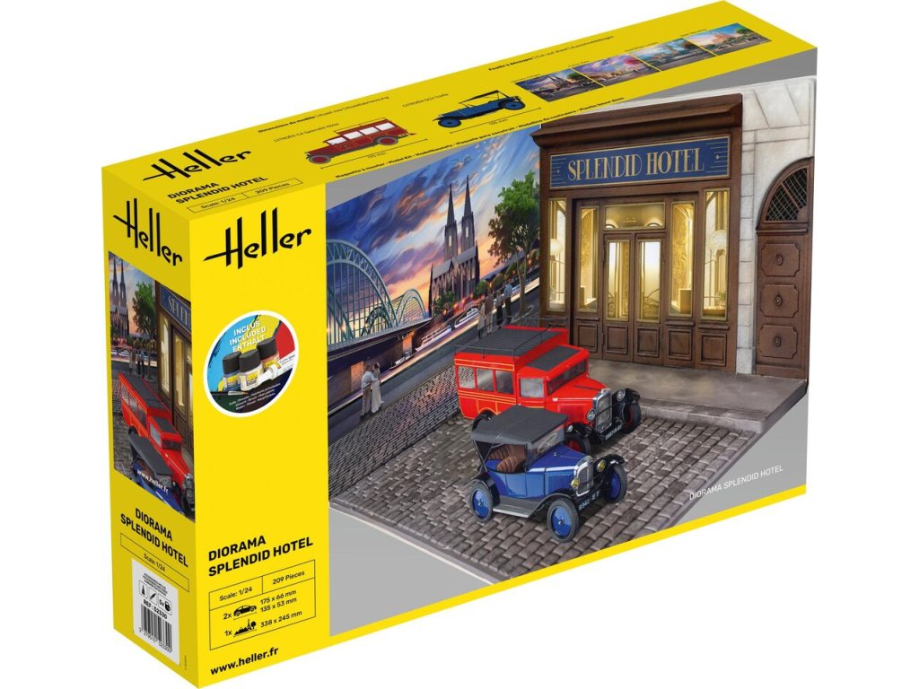 Heller 1/24 Starter Kit Diorama Splendid Hotel to kompletny zestaw do stworzenia szczegółowej sceny w środowisku miejskim z Splendid Hotel. Idealny do dioram z zabytkowymi i nowoczesnymi pojazdami w skali 1/24. Zestaw nie zawiera farb ani klejów potrzebnych do montażu.