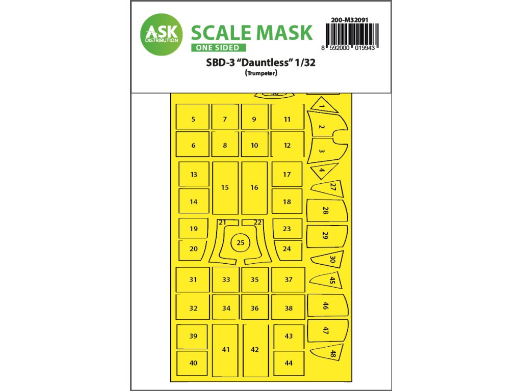 1/32 SBD-3 Dauntless - jednostronna maska do zestawu Trumpetera. Numer katalogowy 200-M32091. Doskonała jakość, najlepszy technologicznie przekrój folii. Przeznaczona do malowania aerografem. Wszystkie części maski mają nadrukowane numery, które wraz z instrukcją jednoznacznie identyfikują zamaskowany obszar na przezroczystych i innych częściach plastikowego modelu.