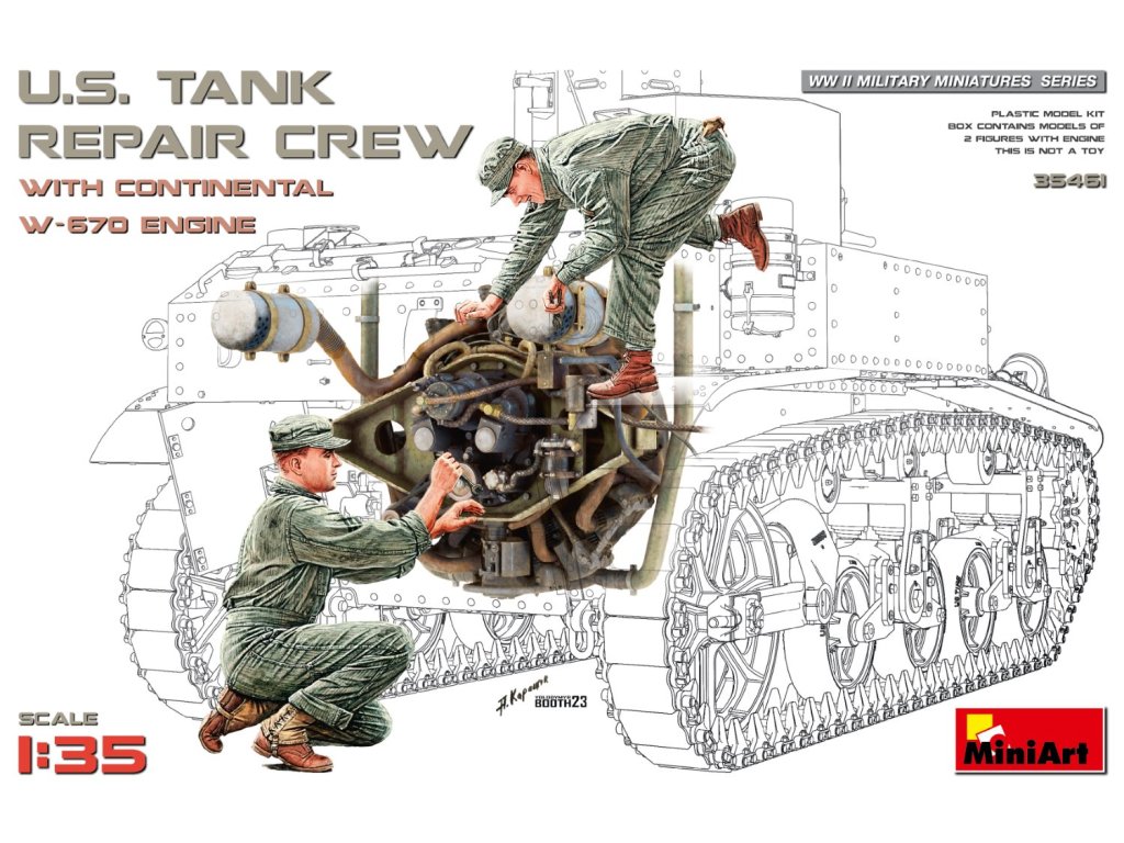 Zestaw MiniArt 1/35 U.S. Tank Repair Crew w/Continental W-670 Engine przedstawia scenę serwisową z II wojny światowej z naciskiem na konserwację amerykańskich pojazdów opancerzonych. Zawiera figurki mechaników czołgowych w pozycjach roboczych, bogate akcesoria w tym narzędzia, sprzęt warsztatowy i szczegółowe odwzorowanie silnika Continental W-670, używanego m.in. w czołgach M3 Stuart. M3 Stuart.