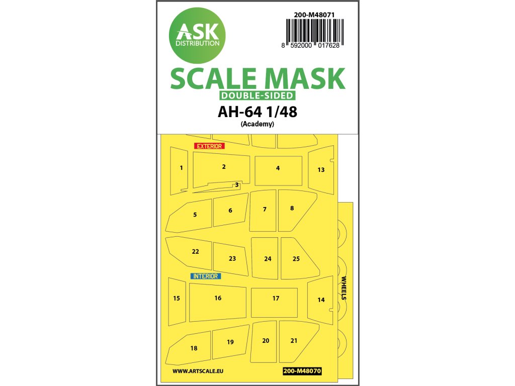 Dwustronna przezroczysta maska 1/48 AH-64 i maski kół do zestawu Academy o numerze katalogowym 200-M48071. Wstępnie przycięta folia maskująca Kabuki najwyższej jakości, najlepsza technologicznie produkcja przekroju folii. Wszystkie części maski z nadrukowanymi numerami, które wraz z instrukcjami określają dokładną pozycję, puszkęi zastosowanie na maskowanym modelu - duże ułatwienie pracy prowadzące do perfekcyjnego modelu.