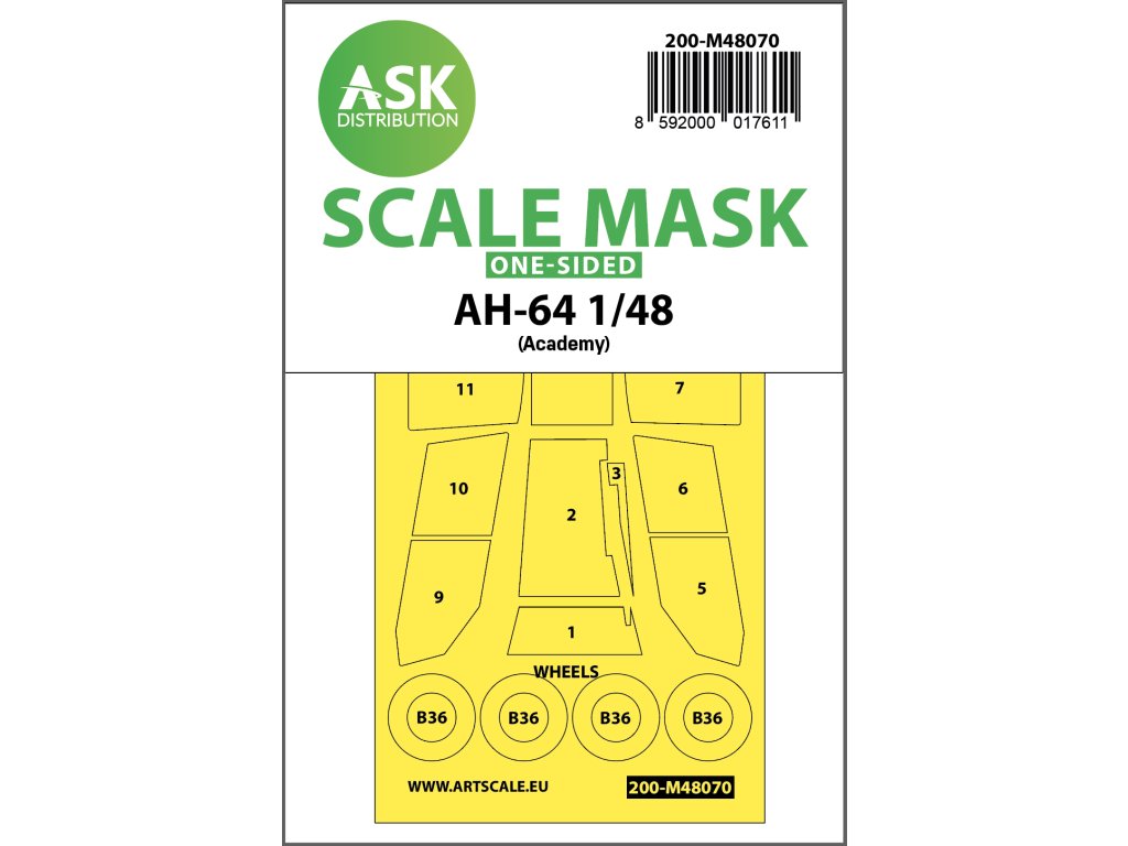 Jednostronna przezroczysta maska 1/48 AH-64 i maski kół do zestawu Academy o numerze katalogowym 200-M48070. Wstępnie przycięta folia maskująca Kabuki najwyższej jakości, najlepsza technologicznie produkcja przekroju folii. Wszystkie części maski z nadrukowanymi numerami, które wraz z instrukcjami określają dokładną pozycję, puszkęi zastosowanie na maskowanym modelu - duże ułatwienie pracy prowadzące do perfekcyjnego modelu.