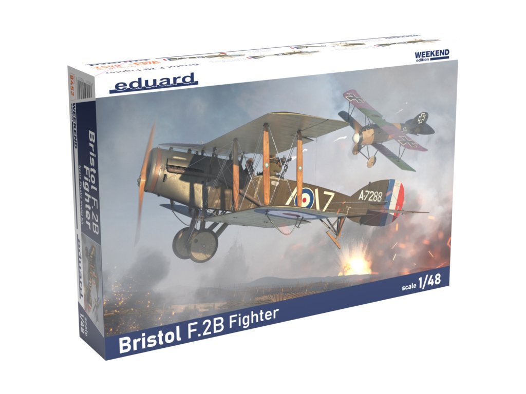 Eduard Bristol F.2B Fighter 1/48 to zestaw brytyjskiego dwumiejscowego dwupłatowca myśliwskiego z okresu I wojny światowej War, oferowany w edycji Weekend z plastikowymi częściami Eduard i kalkomaniami dla czterech schematów kamuflażu. Zestaw nie zawiera farb ani kleju potrzebnych do montażu.