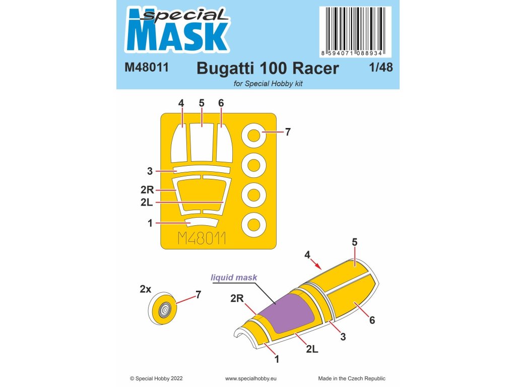 Ten zestaw szablonów maskujących w skali 1/48 dla Bugatti 100 firmy Special Hobby umożliwia precyzyjne maskowanie kokpitu i innych przezroczystych części modelu podczas malowania. Szablony dokładnie pasują do kształtów szkła, ułatwiając nakładanie farby i zapewniając ostre linie malowania. Wykonane z wysokiej jakości materiału, który jest łatwy do nałożenia i usunięcia. Opakowanie nie zawiera farb ani klejów potrzebnych do montażu.