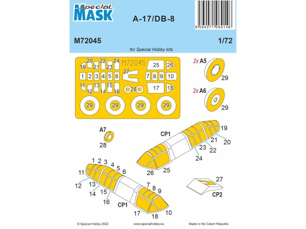 Zestaw szablonów kamuflażu A-17/DB-8 w skali 1/72 firmy Special Hobby umożliwia dokładne maskowanie kokpitu i innych przezroczystych części modelu podczas malowania. Szablony dokładnie dopasowują się do kształtów szkła, ułatwiając nakładanie farby i zapewniając ostre linie malowania. Wykonane z wysokiej jakości materiału, który jest łatwy do nałożenia i usunięcia. Opakowanie nie zawiera farb ani klejów potrzebnych do montażu.