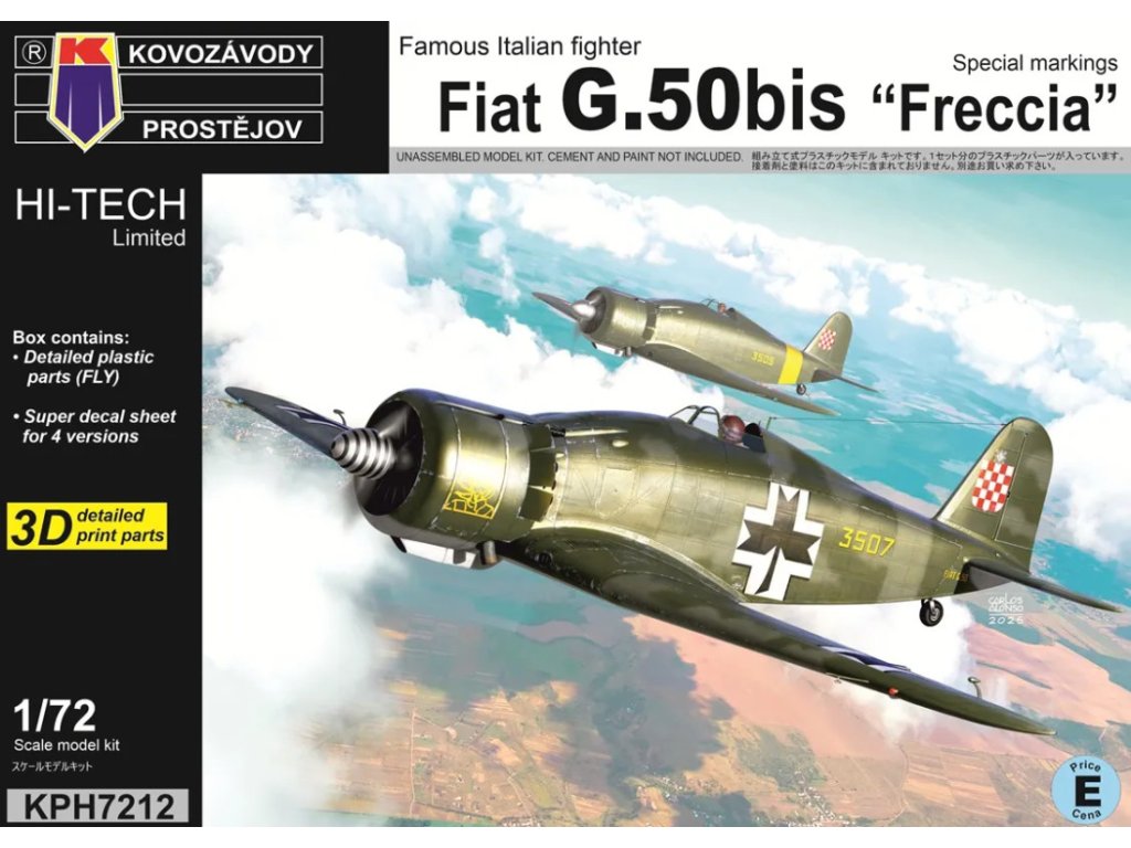 Fiat G.50bis "Freccia" Special markings w skali 1/72 od Kovozávod Prostějov przedstawia ulepszoną wersję włoskiego myśliwca z II wojny światowej w specjalnym kamuflażu. Zestaw nie zawiera farb ani kleju potrzebnych do montażu.