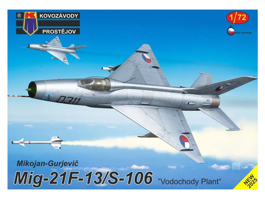 MiG-21F-13/S-106 "Vodochody Plant" w skali 1/72 od Kovozávod Prostějov przedstawia licencjonowaną czechosłowacką wersję legendarnego radzieckiego myśliwca, produkowanego w zakładach Aero Vodochody. Zestaw nie zawiera farb ani kleju potrzebnych do montażu.