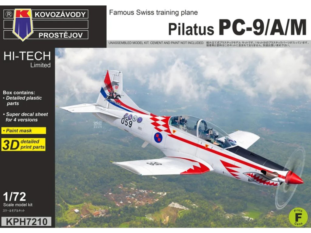 Pilatus PC-9/A/M w skali 1/72 produkcji Kovozávod Prostějov to zestaw lekkiego turbośmigłowego samolotu szkolno-treningowego szwajcarskiej konstrukcji w kilku wersjach używanych m.in. przez Australijskie i Meksykańskie Siły Powietrzne. Zestaw nie zawiera farb ani kleju potrzebnych do montażu.