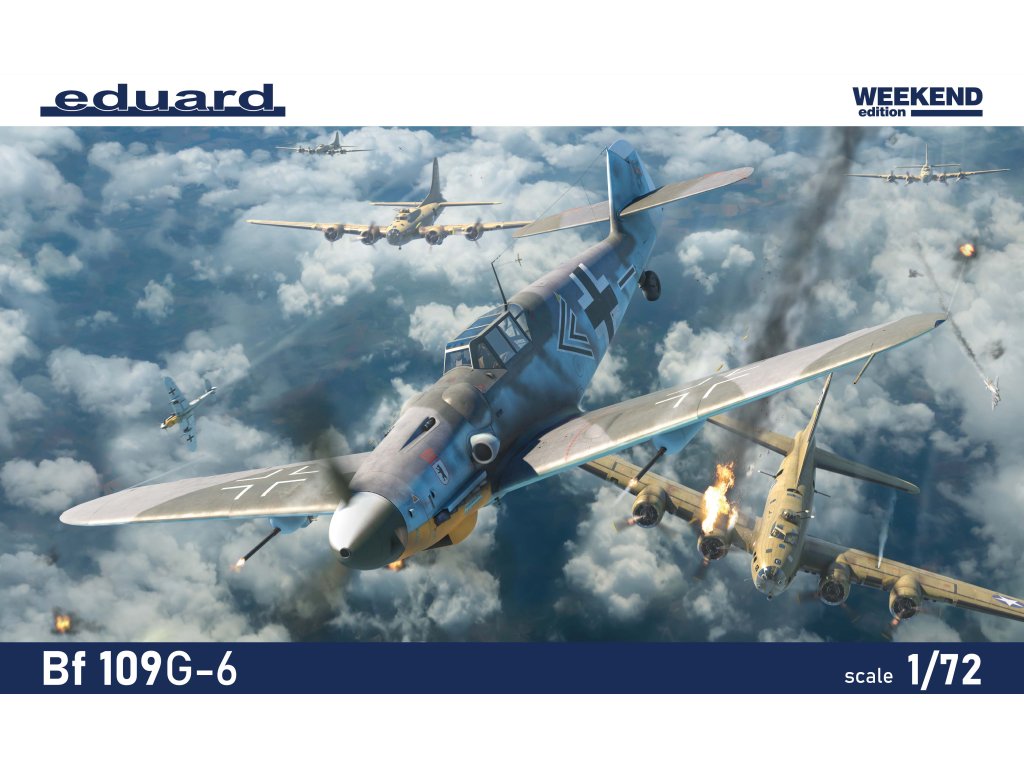 Eduard Bf 109G-6 w skali 1/72 to zestaw niemieckiego myśliwca z okresu II wojny światowej w edycji Weekend, oferujący plastikowe części i kalkomanie dla czterech schematów kamuflażu bez akcesoriów i masek. Zestaw nie zawiera farb ani kleju potrzebnych do montażu.