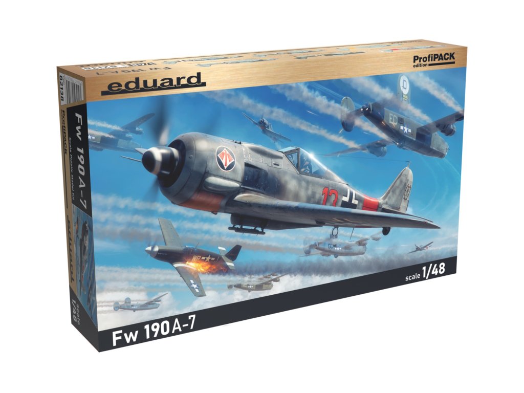 Zestaw Eduard Fw 190A-7 w skali 1/48 (nr kat. 82138) z edycji ProfiPACK oferuje szczegółowe plastikowe części, wytrawione akcesoria, wstępnie wycięte maski i kalkomanie dla sześciu autentycznych kamuflaży: