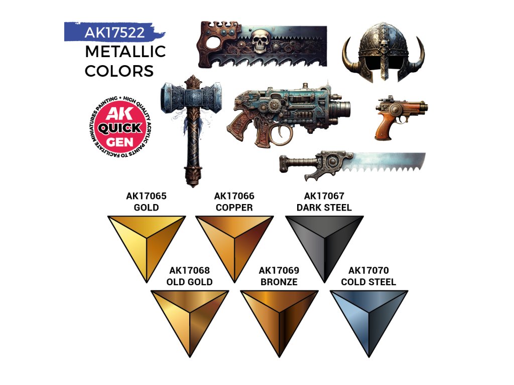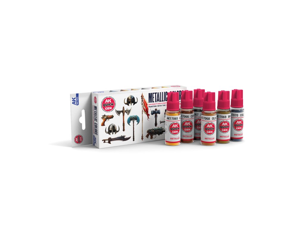 Zestaw farb metalicznych QUICK GEN zawiera pełną gamę farb metalicznych z unikalnymi pigmentami, które tworzą realistyczny efekt metaliczny w jednej warstwie. Idealne do modelowania detali i fantazyjnych wykończeń.