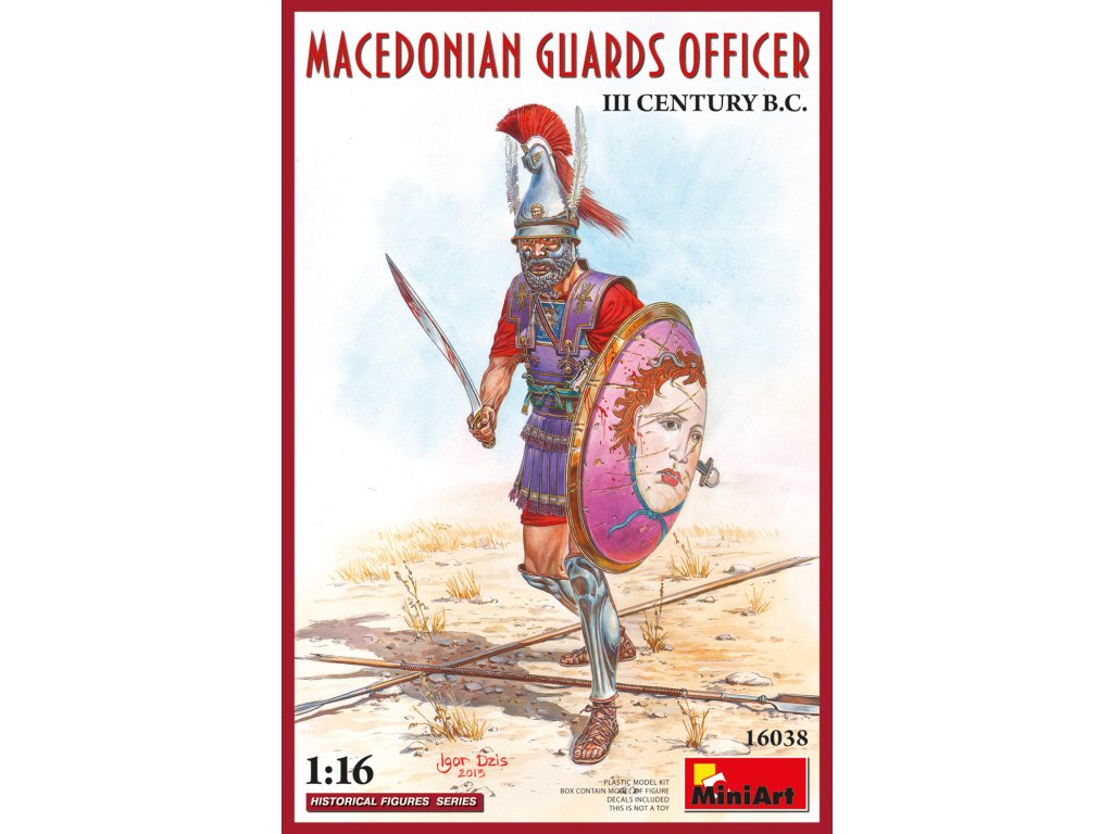 Model macedónskeho gardového dôstojníka v mierke 1:16, III. storočie pred n. l. od spoločnosti MiniArt predstavuje macedónskeho gardového dôstojníka z obdobia vlády Alexandra Veľkého a jeho nástupcov. Detailná figúrka zobrazuje historickú výzbroj a výstroj vrátane prilby, brnenia a typického macedónskeho štítu. Stavebnica obsahuje plastové diely na realistické zostavenie figúrky v dynamickom postoji. Balenie neobsahuje farby ani lepidlo potrebné na zostavenie.