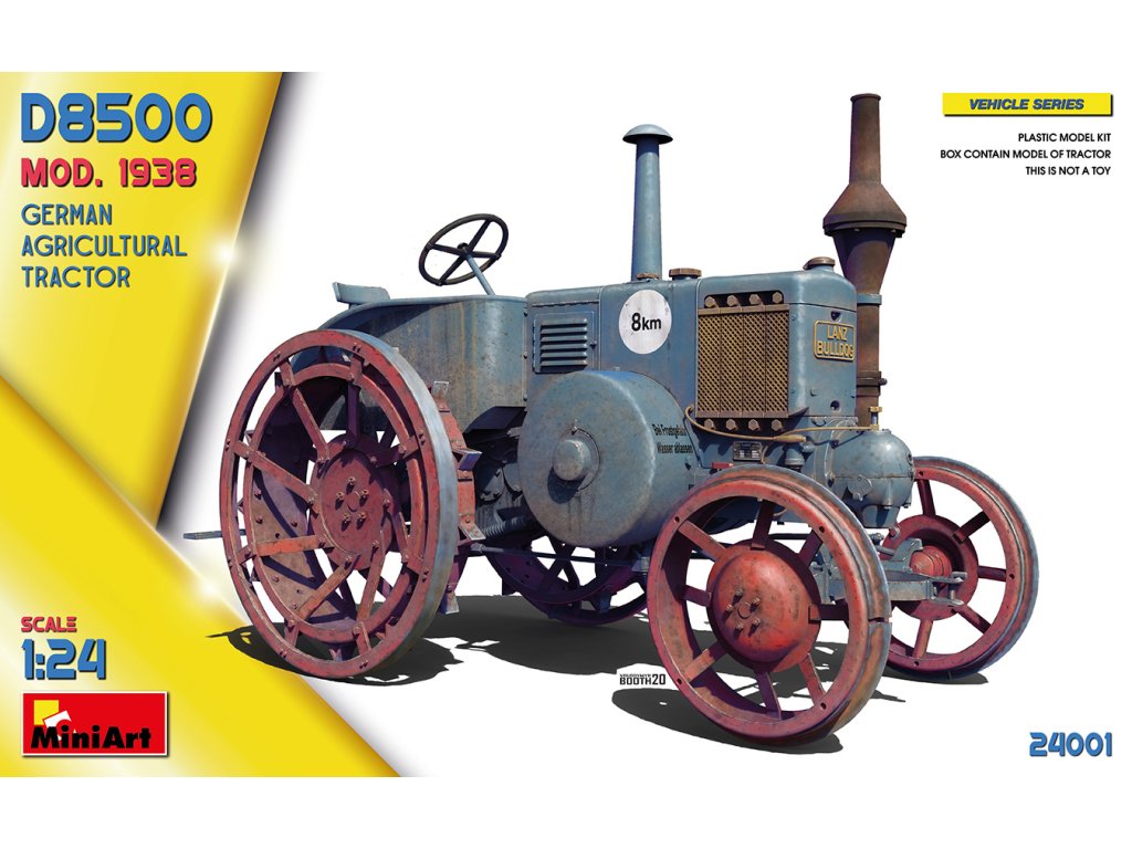 Model nemeckého poľnohospodárskeho traktora D8500 Mod. 1938 v mierke 1:24 od spoločnosti MiniArt je klasický nemecký traktor z konca 30. rokov 20. storočia, ktorý sa hojne využíval v poľnohospodárstve a priemysle. Model vyniká detailným spracovaním motora, karosérie a ovládacích prvkov. Balenie neobsahuje farby ani lepidlo potrebné na zostavenie.