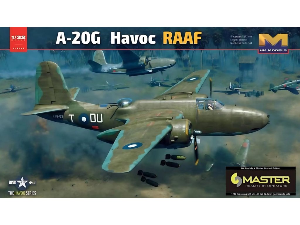 A-20G RAAF Havoc Master Version v mierke 1/32 od HK Models je austrálska verzia amerického útočného bombardéra Douglas A-20G Havoc, ktorý slúžil počas druhej svetovej vojny. Lietadlo sa používalo na hlbinné nálety a útoky na pozemné ciele v Tichomorskom divadle. Táto verzia Master obsahuje kovový podvozok, kovové guľometné hlavne a nosné závažia pre stabilnejšiu stavbu modelu. Vďaka detailnému kokpitu, realistickým motorom a výzbroji je to skvelá voľba pre náročných modelárov. Balenie neobsahuje farby ani lepidlo potrebné na zostavenie.