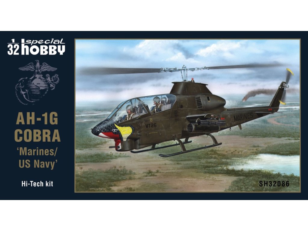 Stavebnica AH-1G Cobra 'Marines/US Navy' Hi-Tech v mierke 1/32 od Special Hobby zobrazuje prvý bojový vrtuľník určený na nasadenie americkou námornou pechotou (USMC) a americkým námorníctvom (USN) počas vojny vo Vietname. Vrtuľník AH-1G Cobra, pôvodne vyvinutý ako útočný variant pre americkú armádu, bol upravený aj pre potreby námornej pechoty, kde poskytoval rozhodujúcu palebnú podporu operáciám v pobrežných a riečnych oblastiach juhovýchodnej Ázie.
