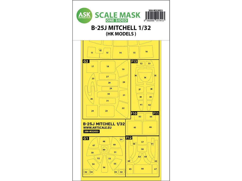 1/32 B-25J Mitchell - jednostranná maska pre stavebnicu HK Models. Katalógové číslo 200-M32033. Vynikajúca kvalita, najlepšia technologická výroba fóliovej časti. Určené na: maľovanie - airbrush. Všetky časti masky sú potlačené číslami, ktoré spolu s návodom jednoznačne identifikujú maskovanú oblasť na čírych a ostatných častiach plastikového modelu.