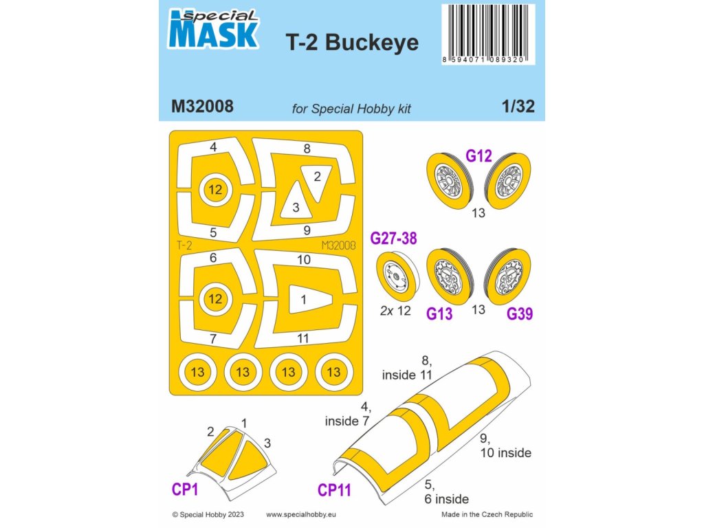 Súprava maskovacích šablón pre model T-2 Buckeye v mierke 1/32 od spoločnosti Special Hobby vám umožní presne zamaskovať kabínu a ďalšie priehľadné časti modelu počas maľovania. Šablóny presne zodpovedajú tvarom skla, uľahčujú prácu počas maľovania a zabezpečujú ostré línie farby. Vyrobené z vysokokvalitného materiálu, ktorý sa ľahko aplikuje a odstraňuje. Balenie neobsahuje farby ani lepidlá potrebné na montáž.