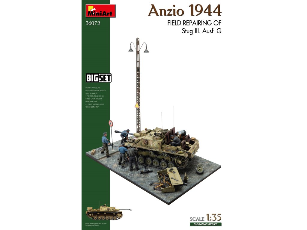 Model Anzio 1944. Poľná oprava StuG III Ausf. G v mierke 1/35 od MiniArtu je veľkorozmerná stavebnica zobrazujúca poľnú opravu samohybného dela StuG III počas talianskej kampane. Obsahuje model interiéru dela StuG III Ausf. G, figúrky vojakov, náradie a opravárenské vybavenie. Balenie neobsahuje farby ani lepidlo potrebné na zostavenie.