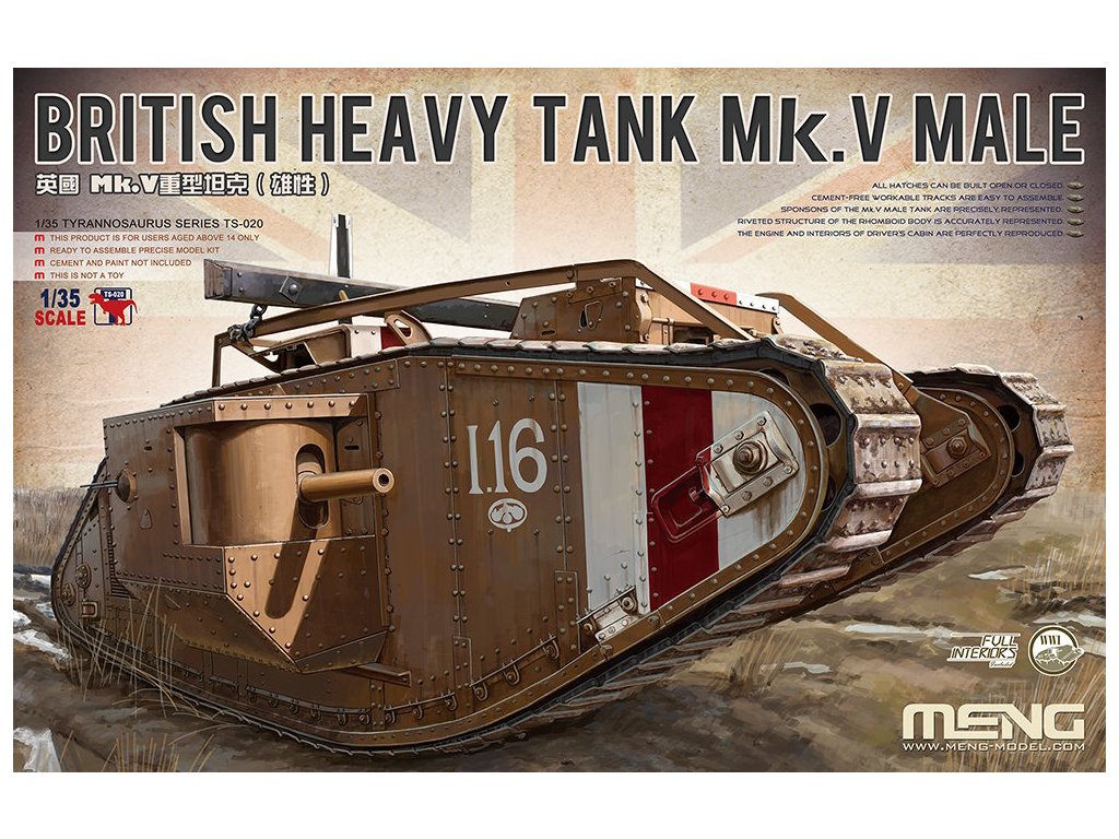 Meng 1/35 Britský ťažký tank Mk. V Male je plastiková stavebnica ikonického britského ťažkého tanku z prvej svetovej vojny v mierke 1/35. Verzia Male bola vyzbrojená delami a predstavovala hlavnú údernú silu týchto priekopníckych obrnených vozidiel.